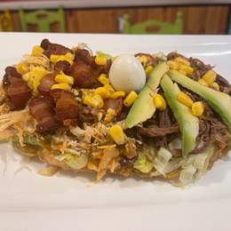 Cama de lechuga, guiso criollo, ternera desmechada, pollo desmechado, chicharrón crujiente, aguacate, maicitos, huevo de codorniz y salsa de la casa