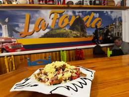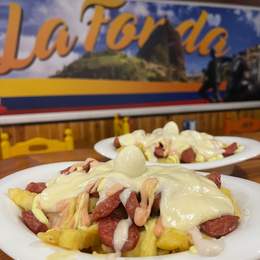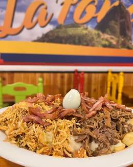 Patatas fritas, salchichas Frankfurt, queso mozzarella, maicitos, chicharrón crujiente, chorizo colombiano, maduritos, ripio de patatas, huevo de codorniz, arepita y salsas de la casa