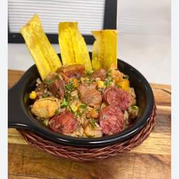 Arroz con verduras, chicharrón, chorizo, pollo, maicitos, aguacate y chips de plátano verde