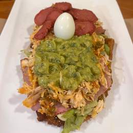 Cama de lechuga, pollo desmechado, salchichas Frankfurt, guiso criollo, guacamole, jamón york, queso mozzarella gratinado, huevo de codorniz y salsas de la casa