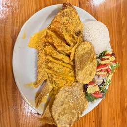 Servida con arroz, yuca con guiso criollo, arroz y ensalada