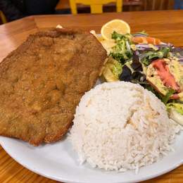 Carne de cerdo empanado (250 g.) con servido con arroz, patacones y ensalada