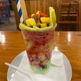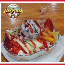 Hielo picado con variedad de fruta, sirope de sabores, leche condensada y milo