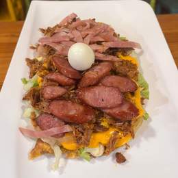 Cama de lechuga, pulled pork, queso cheddar, cebolla caramelizada, salchichas rancheras, bacon, huevo de codorniz y salsa de la casa