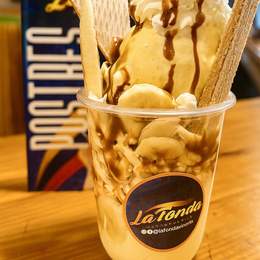 Batido de helado con nata, sirope y barquillos