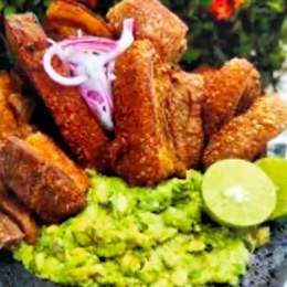 Una reinterpretación con trozos de carne de cerdo jugosa por dentro y crujiente por fuera. Marinado en cítricos con cebolla roja encurtida, guacamole y patacón.