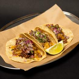 Tacos de maíz, costilla de res deshilachada, cebollita y cilantro. (3UND).