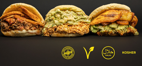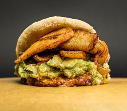 ¡Arepa asada pintosa y de diez! Rellena con YoYo-Salsa, frijoles refritos, aguacate & plátano frito.