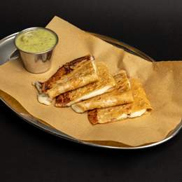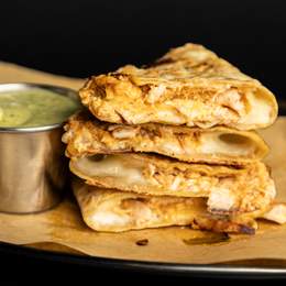 Tortilla de maíz frita en planca, rellena de queso y pollo asado.