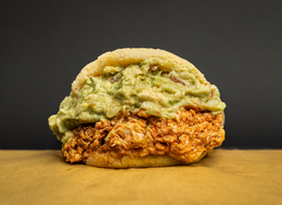 Arepa asada, rellena de pollo, ajo, aguacate, cebollita y mayonesa.