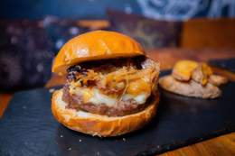 Hamburguesa con carne 100% ECO, queso pecorino trufado y cebolla caramelizada. Acompañada de patatas fritas.