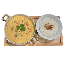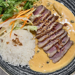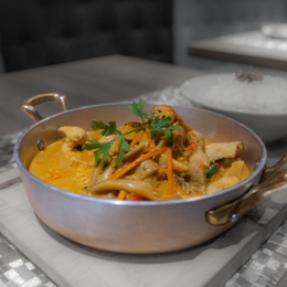 Este curry se caracteriza por su sabor profundo y robusto, que proviene de la cocción lenta de trozos de ternera. La carne se cocina hasta que queda muy tierna, absorbiendo todos los sabores de la salsa.
