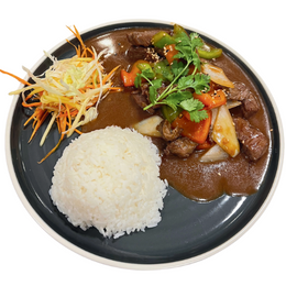 Estofado tradicional vietnamita de ternera cocida a fuego lento con especias, zanahoria y un toque de hierba de limón. Servido con arroz blanco