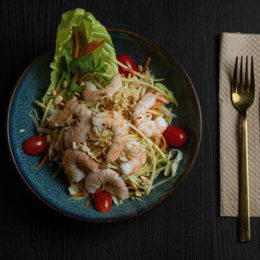 Fideos de arroz salteados al wok con gambas, verduras frescas y salsa especial vietnamita. Plato aromático, sabroso y con un toque salteado único