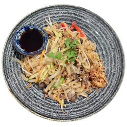 Fideos de arroz salteados al wok con ternera, verduras frescas y salsa especial vietnamita. Plato aromático, sabroso y con un toque salteado único