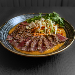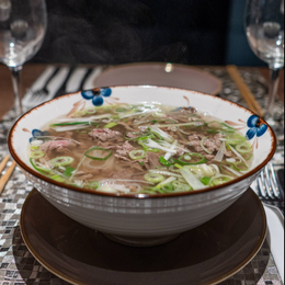 Sopa tradicional vietnamita con caldo cocido a fuego lento durante horas, extraído de huesos y especias aromáticas. Servida con fideos de arroz, hierbas frescas y ternera tái lăn