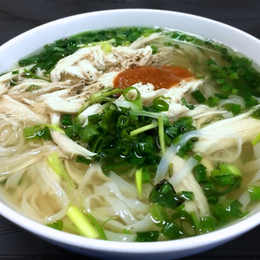 Sopa tradicional vietnamita con caldo cocido a fuego lento durante horas, extraído de huesos y especias aromáticas. Servida con fideos de arroz, hierbas frescas y pollo