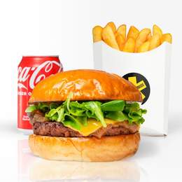 Burguer de ternera, queso cheddar fundido, pepinillos, cebolla fresca y salsa mil islas + Patatas + Bebida