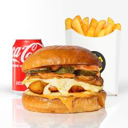 Doble burguer de ternera, queso cheddar fundido, pepinillos, cebolla fresca y salsa mil islas + patatas + Bebidas