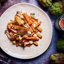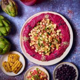 Alcachofas marinadas con queso de cabra y hummus clásico