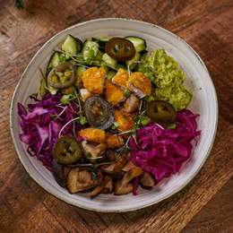 La combinación de sabores perfecta. ¡Mucha variedad de sabores, texturas y proteínas! Lechuga, pepino crujiente, tomates jugosos, coco rallado, hummus y frijoles negros