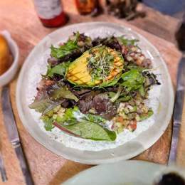 Aguacate asado con ensalada verde, tartar de verduras y salsa de pepino