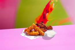 3 Tiras de pollo crujiente, 3 alitas y una salsa a elegir