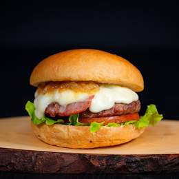 Pan de hamburguesa, carne de vacuno premium (160g), queso mozzarella fundido, bacon crujiente y salsa a elegir.