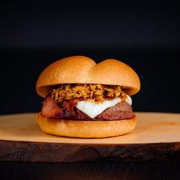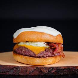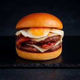 Pan de hamburguesa, doble carne de vacuno premium (160g), doble mozzarella fundida, crujiente bacon, huevo frito, cebolla frita y la salsa de tu elección.