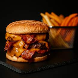 Pan hamburguesa, triple carne de vacuno premium (160g), bacon crujiente y queso cheddar fundido, elige la salsa que más te guste.