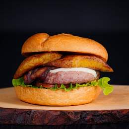 Pan de hamburguesa, carne de vacuno premium (160g), queso mozzarella fundido, bacon crujiente, plátano maduro caramelizado, lechuga fresca, tomate jugoso y un toque de salsa a elegir.