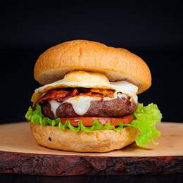 Pan de hamburguesa, carne de vacuno premium (160g), queso mozzarella fundido, bacon crujiente, huevo campero frito, cebolla frita, lechuga fresca, tomate jugoso y un toque de salsa a elegir.