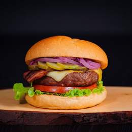 Pan de hamburguesa, carne de vacuno premium (160g), doble queso mozzarella fundido, bacon crujiente, cebolla a la parrilla, brotes de lechuga fresca, tomate jugoso y la salsa de tu elección.