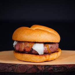 Pan de hamburguesa, carne de vacuno premium (160g), queso mozzarella fundido, bacon crujiente, chucrut, pepinillos, cebolla a la plancha y la salsa de tu elección.