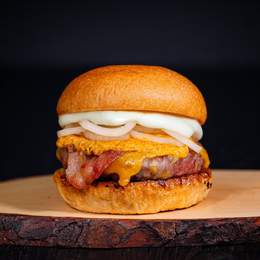 Pan de hamburguesa, carne de vacuno premium (160g), queso mozzarella fundido, bacon crujiente, una mezcla jugosa de carne deshilachada de ternera y cerdo, cebolla frita y un toque de salsa a elegir.
