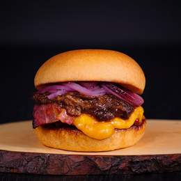 Pan de hamburguesa, carne de vacuno premium (160g), una combinación de queso azul, mozzarella y cheddar fundido, acompañado de bacon crujiente y la salsa de tu elección.