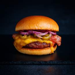 Pan de hamburguesa, carne de vacuno premium (160g), queso mozzarella fundido, bacon crujiente, tres aros de chili & cheese, pepinillos, brotes de lechuga fresca, tomate jugoso y la salsa de tu elección.