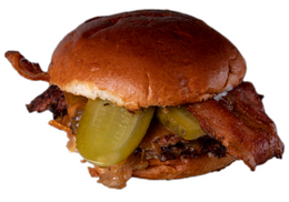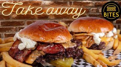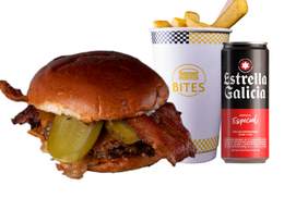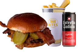 Smash Burger con pan Juanito Baker, carne de falda de vaca madurada, queso cheddar, doble bacon, pepinillos, cebolla, salsa Bites con patatas fritas incluidas