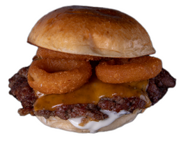 Smash Burger con pan Juanito Baker, carne de falda de vaca madurada, queso cheddar, aro de cebolla picante, cebolla caramelizada, salsa Bites y con patatas fritas incluidas