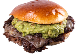 Smash Burger con pan Juanito Baker, carne de falda de vaca madurada, queso cheddar, queso edam, cebolla caramelizada, salsa Bites y guacamole y con patatas fritas incluidas
