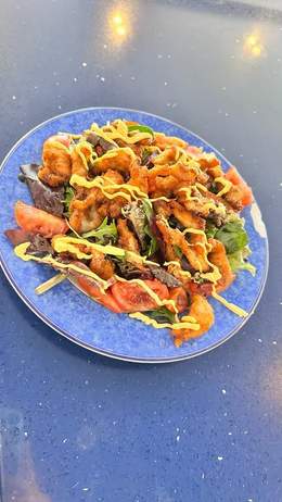 Salsa barbacoa, lechuga, carne 100 % de vacuno, queso Cheddar, aros de cebolla, beicon crujiente, cebolla caramelizada y salsa Deep Blue