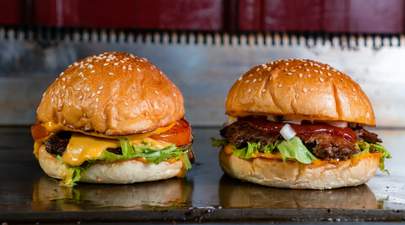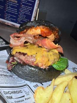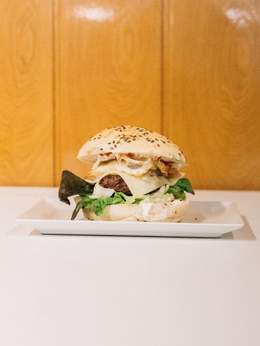 Salsa barbacoa, lechuga, carne 100 % de vacuno, cebolla caramelizada, rulo de queso de cabra a la plancha, salsa Deep Blue y bacon crujiente