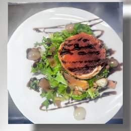 Lechuga Mezclum, taquitos de membrillo rojo, cebollitas en vinagre balsámico, Croûton y rula de queso de cabra a la plancha