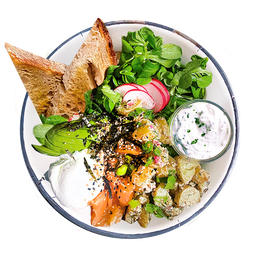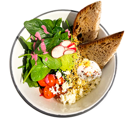 Pan de masa madre de Turris, huevo poché, salmón ahumado, aguacate, patatas asadas con hierbas, rabanitos y nori mix ( mix de alga nori con sésamo y togarashi) Salsa: Cilantro sour cream