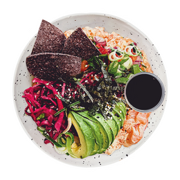 Arroz de sushi, salmón sashimi, aguacate, pico de gallo, pickle de col lombarda, chips de tortilla artesanal, nori mix (mix de alga nori, sésamo y togorashi) Salsa: Yuzu ponzu y Chipotle mayo