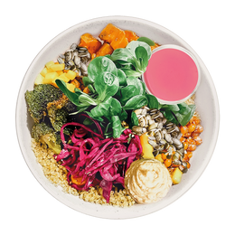 Quinoa bio, canónigos, boniato asado, garbanzos rosti, brócoli al horno, pickle de col lombarda, mango, hummus, semillas de girasol. Salsa: Beet tahini (VEGAN)