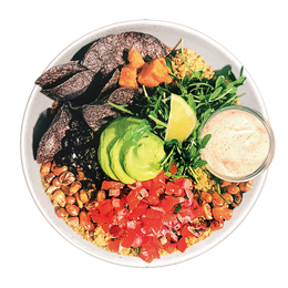 Quínoa bio, rúcula, guacamole, boniato asado, frijoles negros, pico de gallo, cebolla fritas, chips de tortilla artesanales. Salsa: Chipotle mayo
