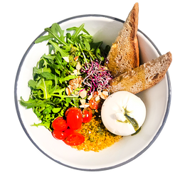 Pan de masa madre de BALUARD, auténtica burrata italiana, quinoa bio, rúcula, tomaticos cherry, mix de pistachos, anacardos y almendras. Salsa: Pesto de albahaca