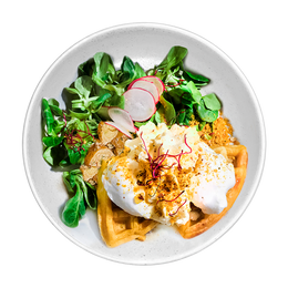 Waffles con cúrcuma, 2 huevos poché, salsa benedictina, cánonigos, patatas asadas con hierbas y dukkah ( mix de frutos secos con 7 especies del oriente medio )