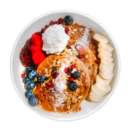 Vegan pancakes con frutos rojos, acompañados de granola homemade, coco deshitratado, sirope de arce, mermelada de frutos rojos, fruta de temporada y espuma de coco y pandan (VEGAN)